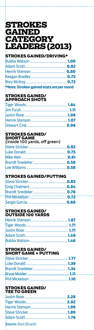 Tiger gained 1.64 strokes just with his approach shots . He lead that category by more than half a shot. That lead over second place is larger than the 0.424 strokes gained putting.