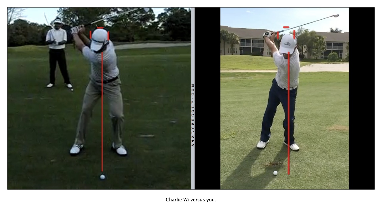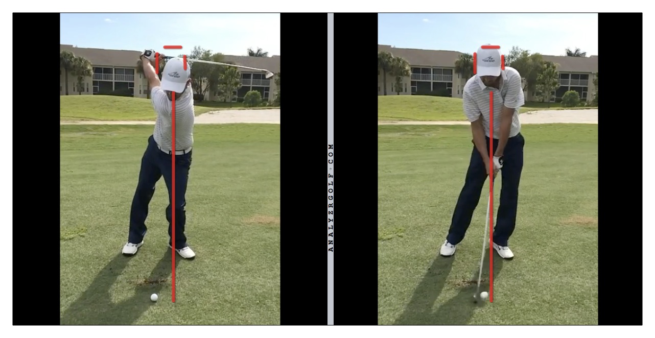 I'm aware my head drops on the downswing but it hits the same spot it started in at impact as I stand up. Not to say I shouldn't work on that but since it is evident in both swings it doesn't seem like the fix to me.