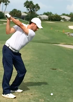 I think he is on it here still. I don't think you would get much more power out of your practice swing either because your hips do not change. I went through some painful rounds because I was swinging to hard with my arms when I hit the ball. What helped me and TIFWIW, was to stop (perceive to) at the top of my back swing and allow my body to get started first, allowing my hips to turn. I was losing all my lag, yanking the club down and getting off my front foot. You still get plenty of power with the swing.