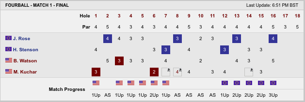 From what I saw, Europe played very well. In the Rose/Stenson match, the foursome had 21 birdies in 16 holes (Europe won that match). Kind of been the theme, USA plays well but Europe just takes it to a different level.