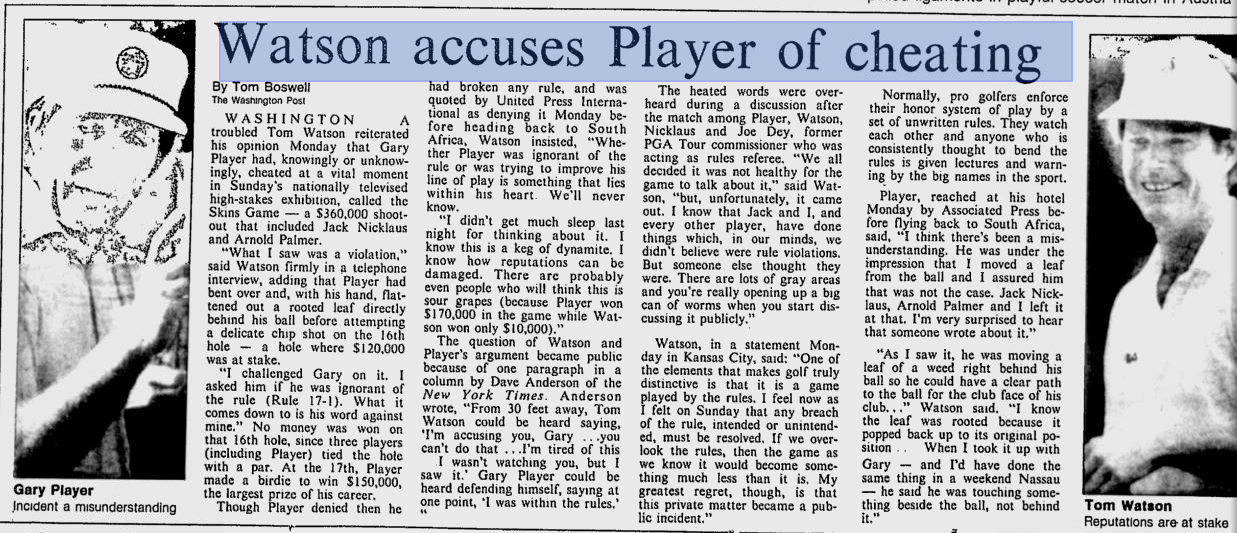 Yeah, um only he didn't.  Arnold Palmer and Jack Nicklaus were part of that Skins game foursome and saw nothing wrong in what Player did (removing a leaf from behind his ball). No skins were won on the hole as Watson, Player and Nicklaus all ended up with pars. And there was no other field to protect. Watson was just being an over competitive, dictitorial a-hole, making an accusation without thinking of the implications.  Player to this day, says it still hurt him greatly.