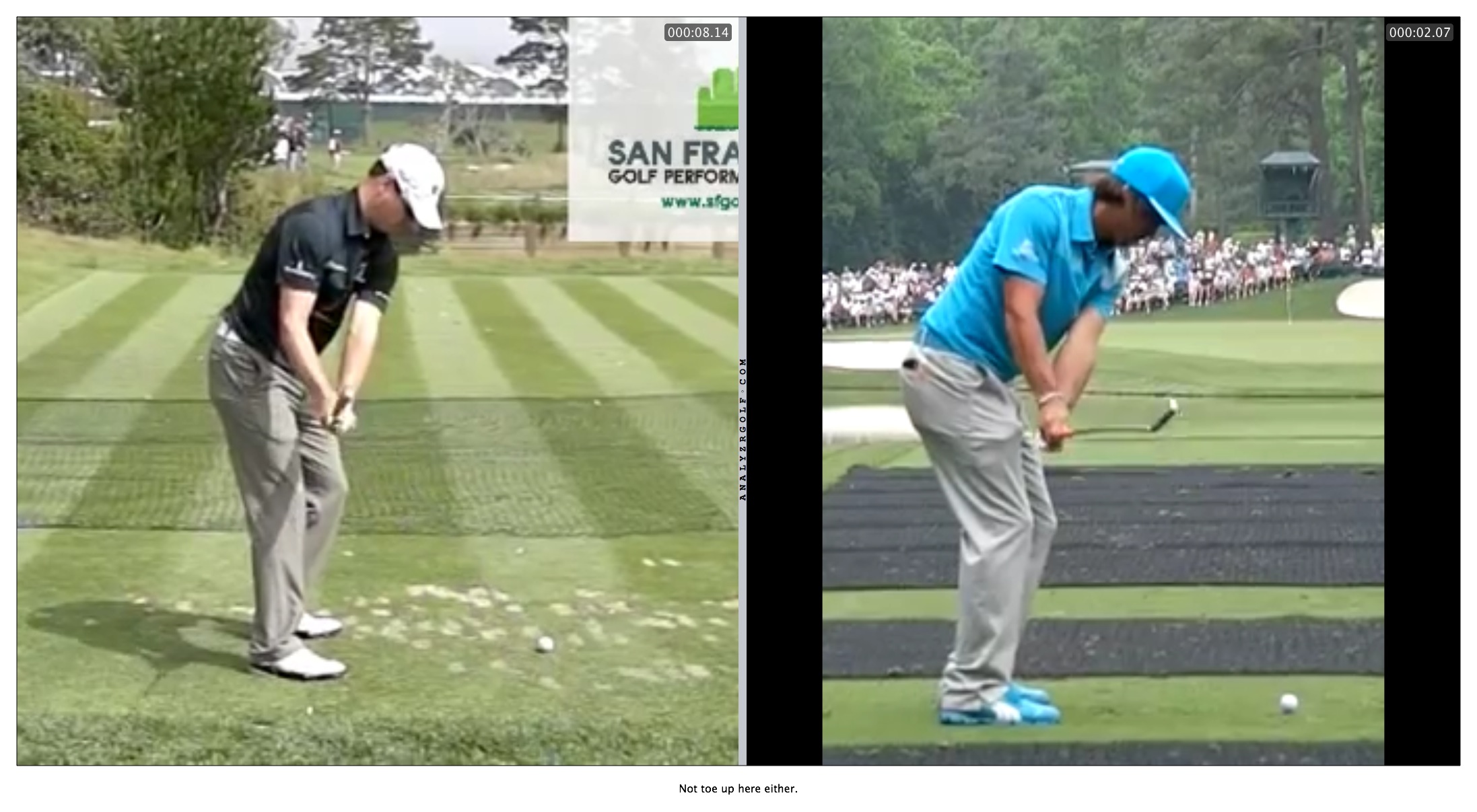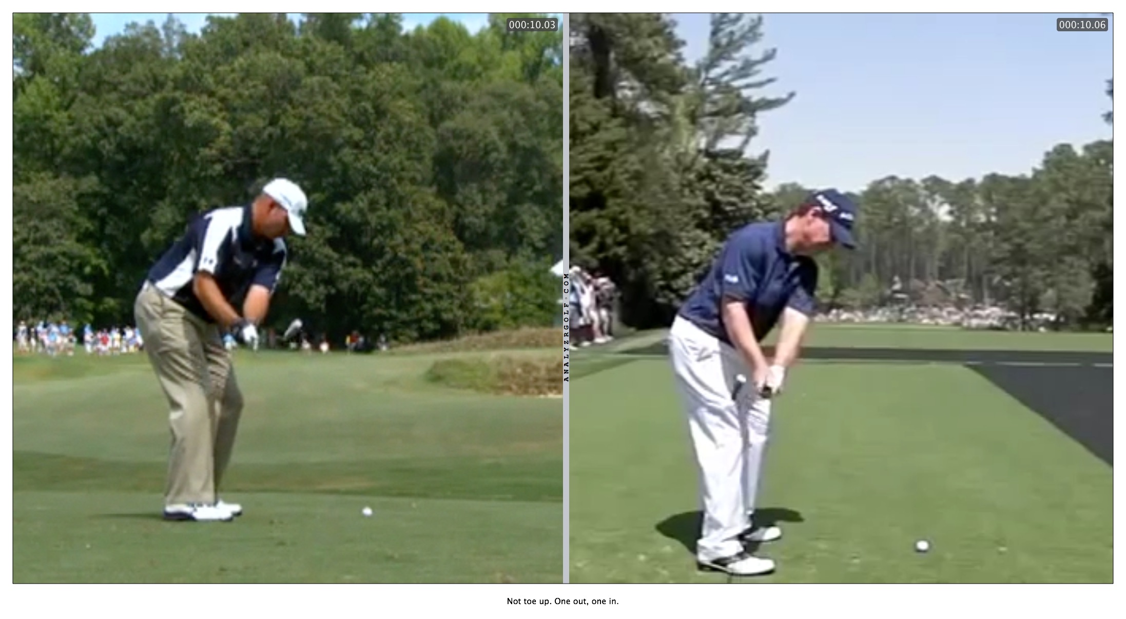 As for "taking over", I am talking about the hands and arms, for example, picking up the club - jerking inside, outside, etc.,  The plane is then destroyed.  The only way to achieve the proper plane is for the shoulders to dictate the backwing start.  Once the club reaches the "shaking hands" position (parallel to the ground) by way of the left shoulder and the naturally rotating wrists, everything else sort of falls in place, at least for us.   That is what I call the "toe up" position.  If the set-up, grip, and swing start are fundamentally correct, the toe is up.  I realize there are tour players that are open or closed in this position, and God bless 'em.  But they are having to do some mid-swing manipulation back to the ball for that to work out.