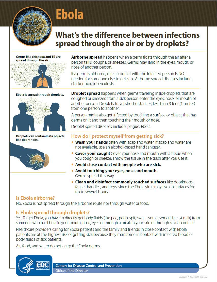 Here is the newest poster that the CDC released on Ebola.  It shows that while it's not currently airborne you can get it from someone sneezing or coughing and the droplets landing on a surface that you touch, such as a handrail on an escalator.