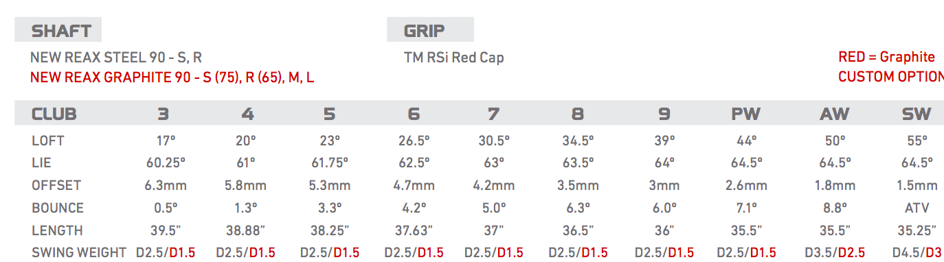 RSi 2 ... The most resounding characteristic of the RSi 2 is the Progressive Multi-Material Construction. The 3-5 irons are cast from 450 stainless steel with tungsten weighting to promote a lower CG and slightly higher flight. The mid irons (6-7) are cast of 450 stainless steel, as well. The high- strength material allowed engineers to make the face thinner, undercuts deeper and accommodate slot technology. The short irons (8, 9, PW) incorporate forged faces to promote feel and accuracy; and the wedges are completely forged, giving them the look, feel and workability desired by better players. RSi 2 irons come stock with the all-new KBS Tour 105 shaft .”