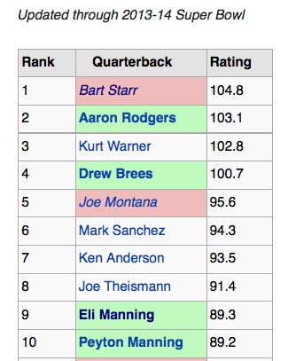 Ultimately--and this is the meat of it--unless you think those guys are better than Brady, you have to admit that playoff win % is not the best indicator.  And once you admit that, your sole knock against Peyton disappears, as does your sole stated reason for choosing anyone else over Manning--be it Brady in a playoff game, or Montana/Starr as GOAT.