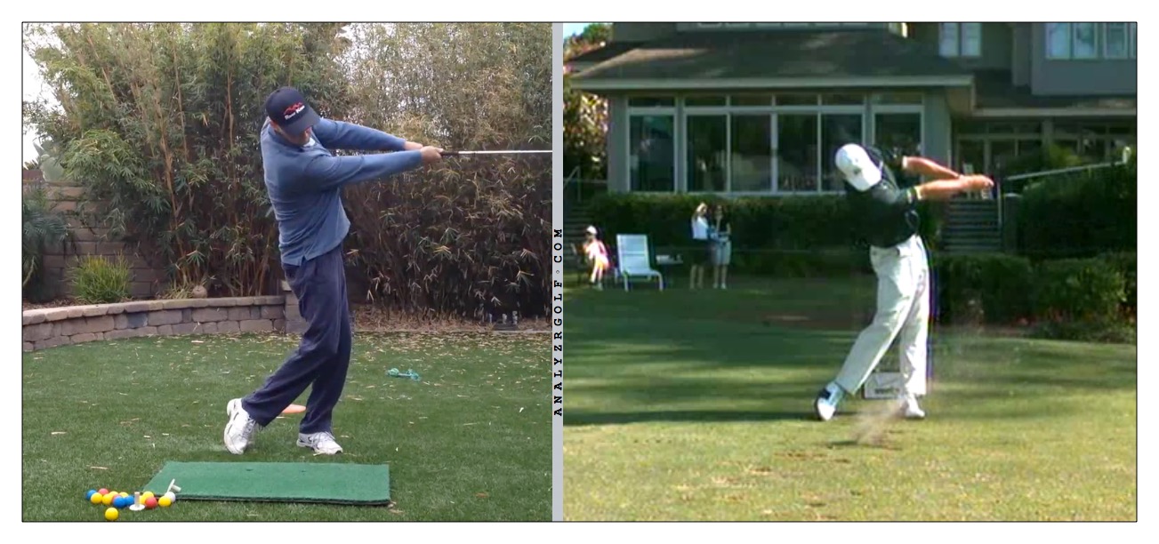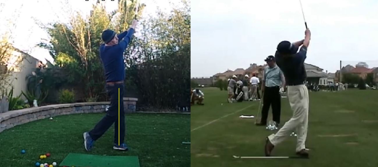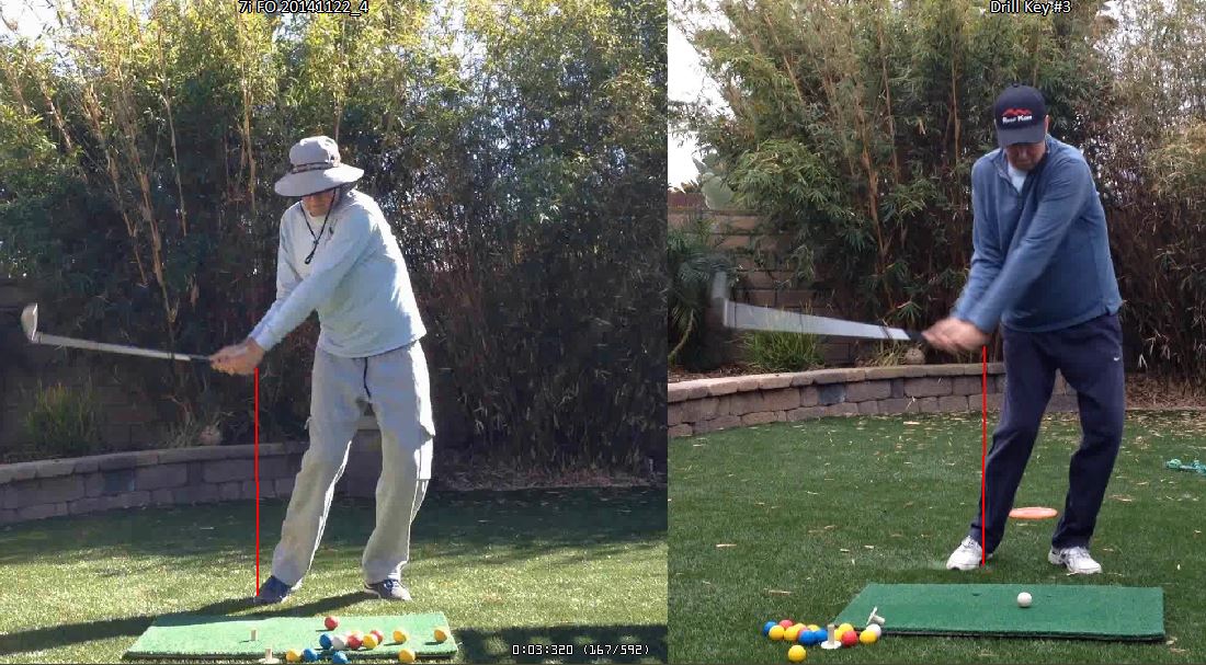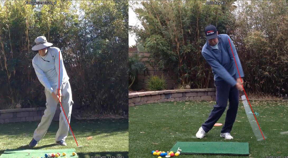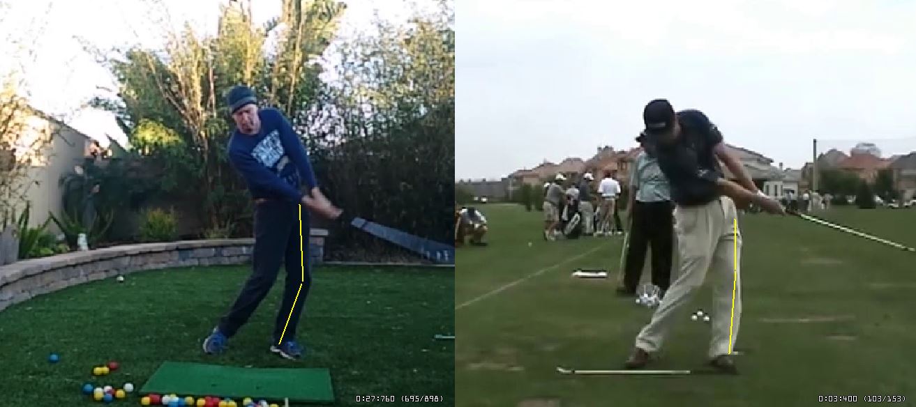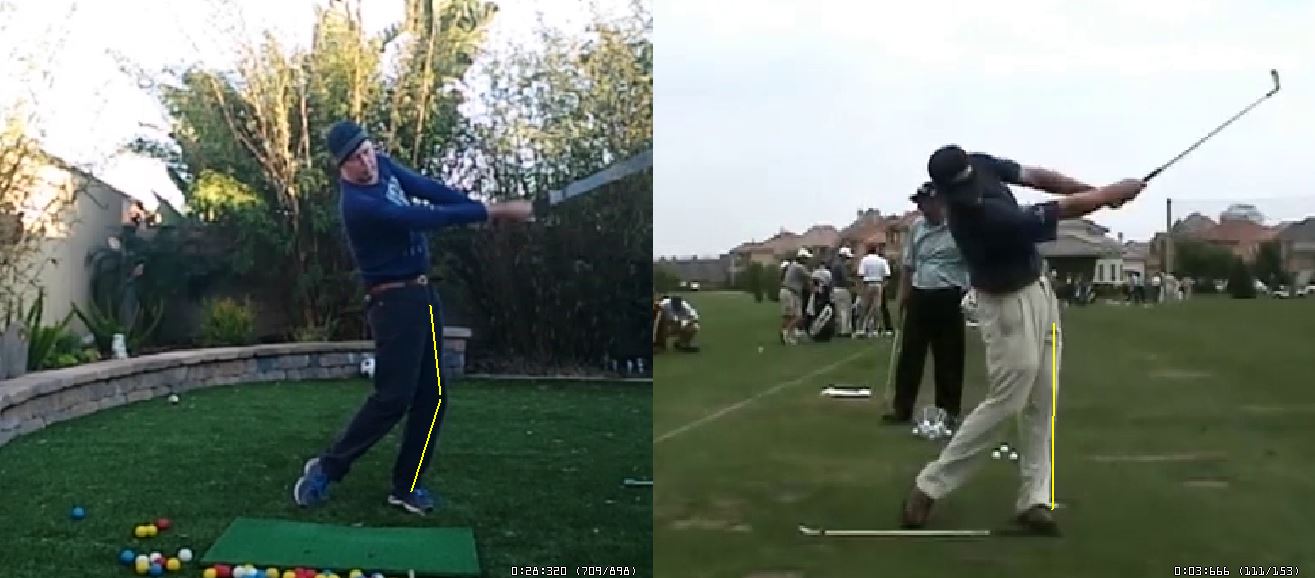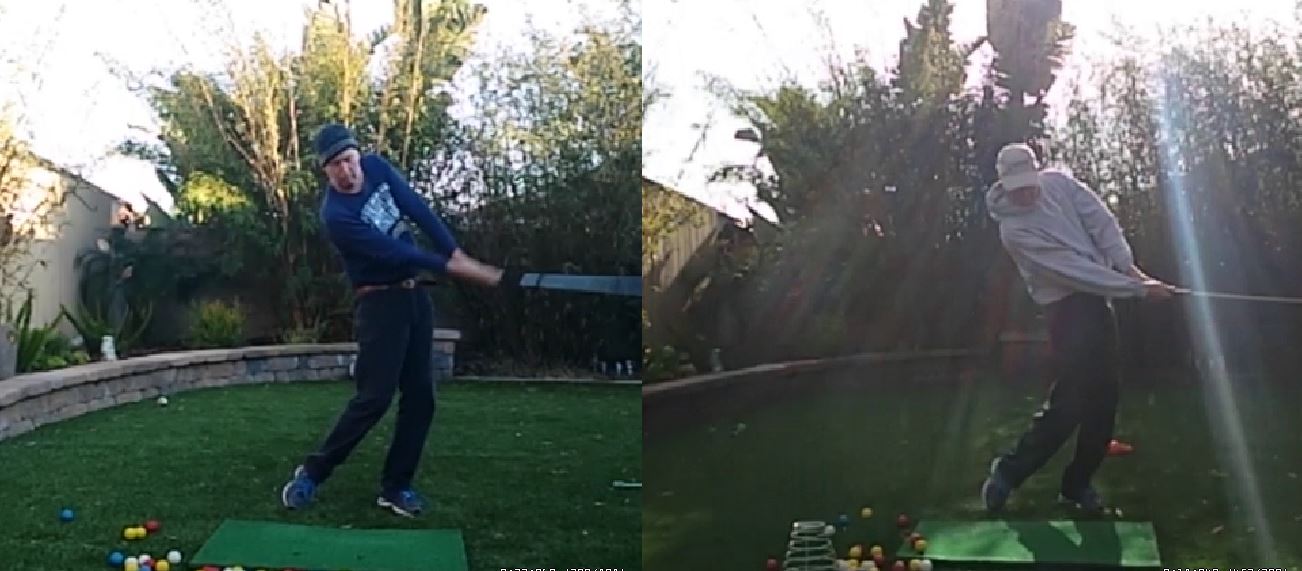 Below left is today, right is the swing I submitted a week or so ago for my evolvr lesson.  I have made some progress, lead leg a little bit straighter, and my exit isn't so to the left and my left arm isn't stuck to my side.