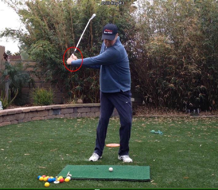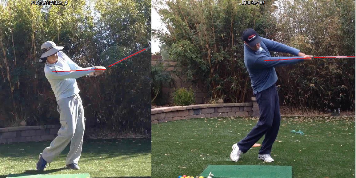 My instructor wants me to get my hands closer to my thigh when the club is still parallel.  This shows the original swing to the instructor (on the left) and where it is doing this drill (on the right).