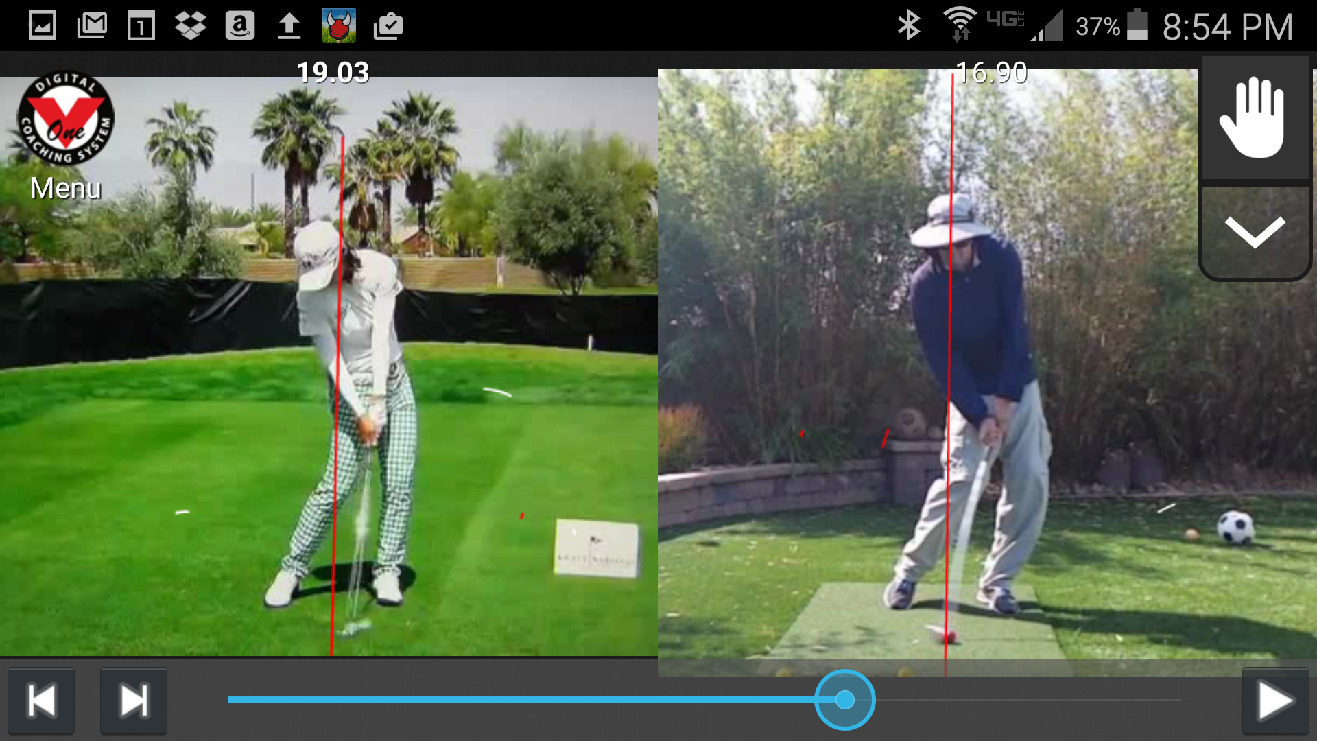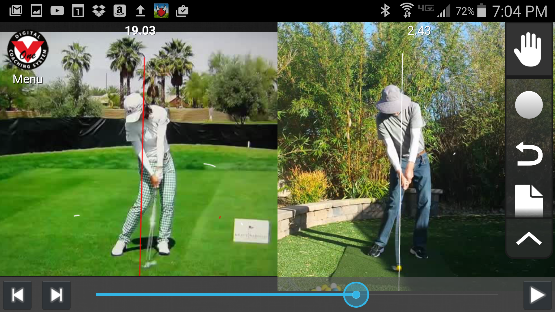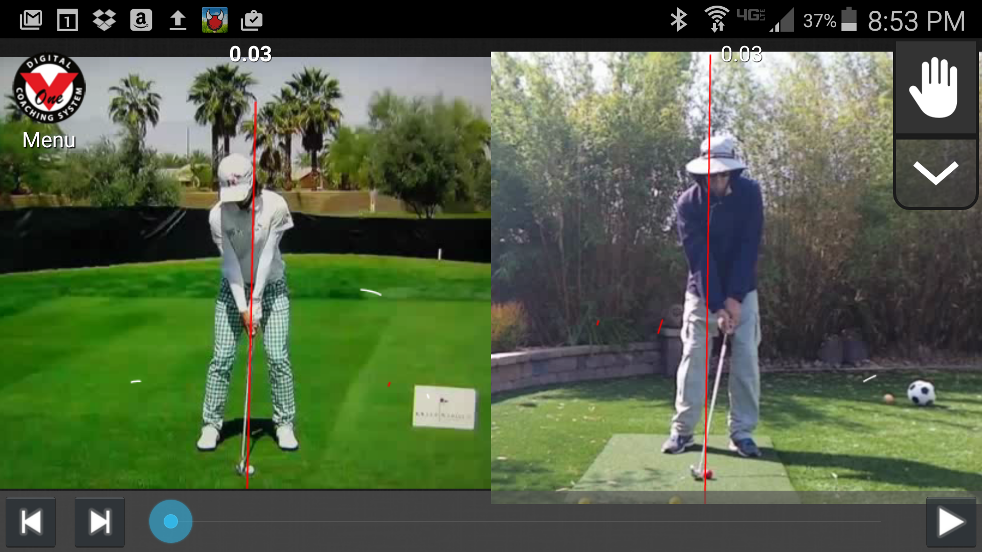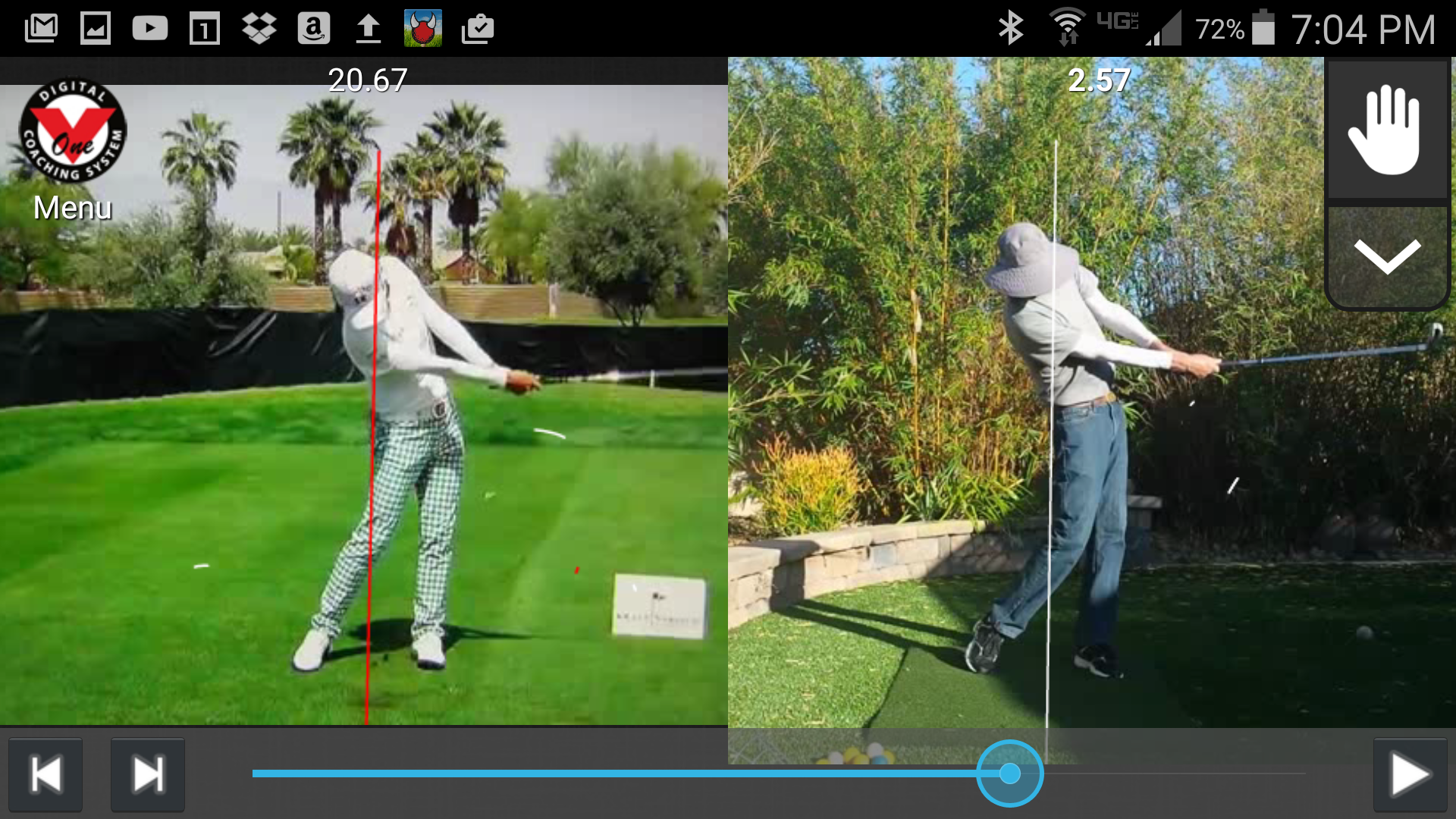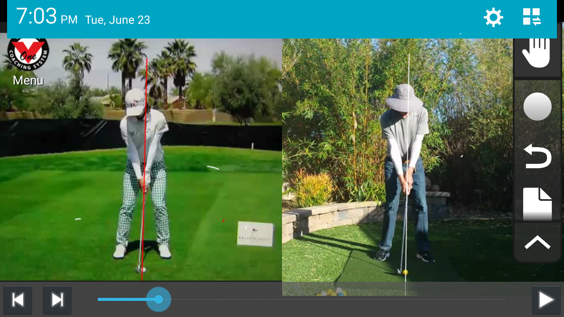 Comparison screenshots from that video above.  I think I've made an improvement during this practice in my setup and straightening my leg at impact.  Rather than thinking about my leg, I was focusing on my belt buckly, forward and up, a kind of thrust as I've heard @iacas has instructed before.