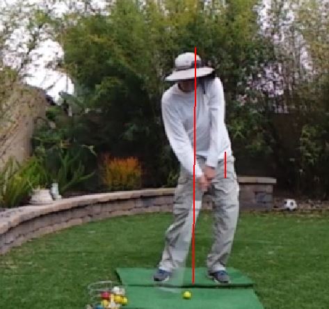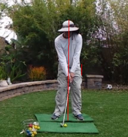 Setup, an improvement over previous posts picture.  I think I can use more tilt, it felt like I had more tilt than that.  My head wants to get back behind that line at impact, I think I might as well start with my head back there like Na Yeon Choi does.