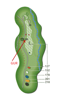 That's a short par four shown there. From the front of the back tee it's 218 yards to the point in the fairway from which it's just over 135 to reach the green.