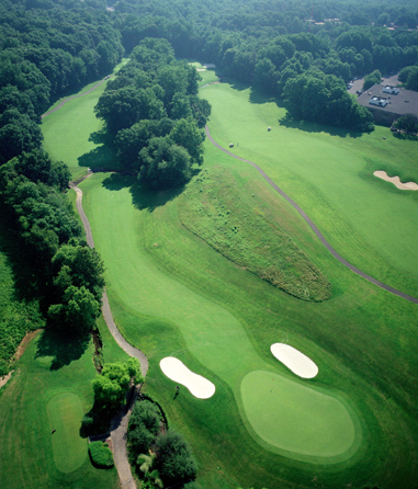One of the most difficult holes in the Middle-Atlantic region. It demands two long, precisely stuck shots to reach the green in regulation, while avoiding the tall hardwoods and water hazard, The creek meanders across the fairway and runs precariously close to the right side all the way past the green.