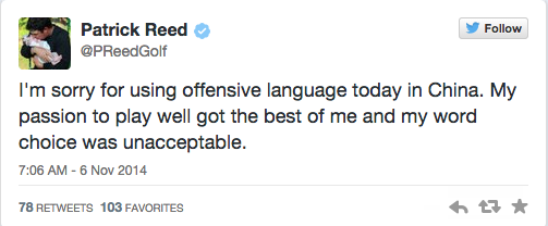 Patrick Reed has gone from one of my least favorite to one of my favorite golfers in the span of one season...  Sure, he shouldn't be spouting slurs and F-bombs, but at least the kid has some balls and a little fire...  His top 5 comment came off as cocky and a little entitled, but at least he wants to win and he believes in himself and has a little bit of an F-you attitude...I think he's shown he's more like your typical golfer, at least mentally, than any of us might have originally expected..Maybe golf's popularity, at least in the states, would grow if a few more guys had that intensity on the inside.. He doesn't come off as another Chris Kirk, Harris English, Jim Furyk type country club silver spooner who would offer up a limp finger handshake and who could care less about winning and beating an opponent.  Good for him, be a little gritty and go out and beat someone-- The last young American golfer with Reed's fire and intensity was caught more than once cursing himself out on the course as well...14 majors later I think it worked out for him.