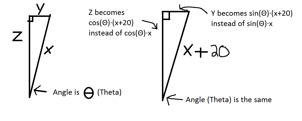 As a nice benefit of the angle being small, you will affect your Z distance much more than your Y distance as you increase the length of the hypotenuse. This is due to cosine values approaching 1 as your degrees approach 0, and your sine values approaching 0. So adding 20 yards of distance with the same degree of accuracy will make you become ~15-20 yards closer to the hole, while only ~0-5 yards further offline (depending on the actual measured angle, of course).