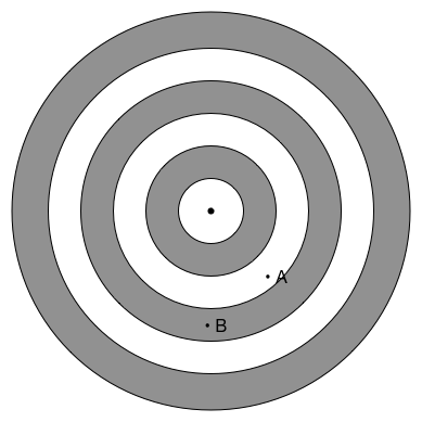 If the balls were plotted on a graph (A and B), which is more accurate?