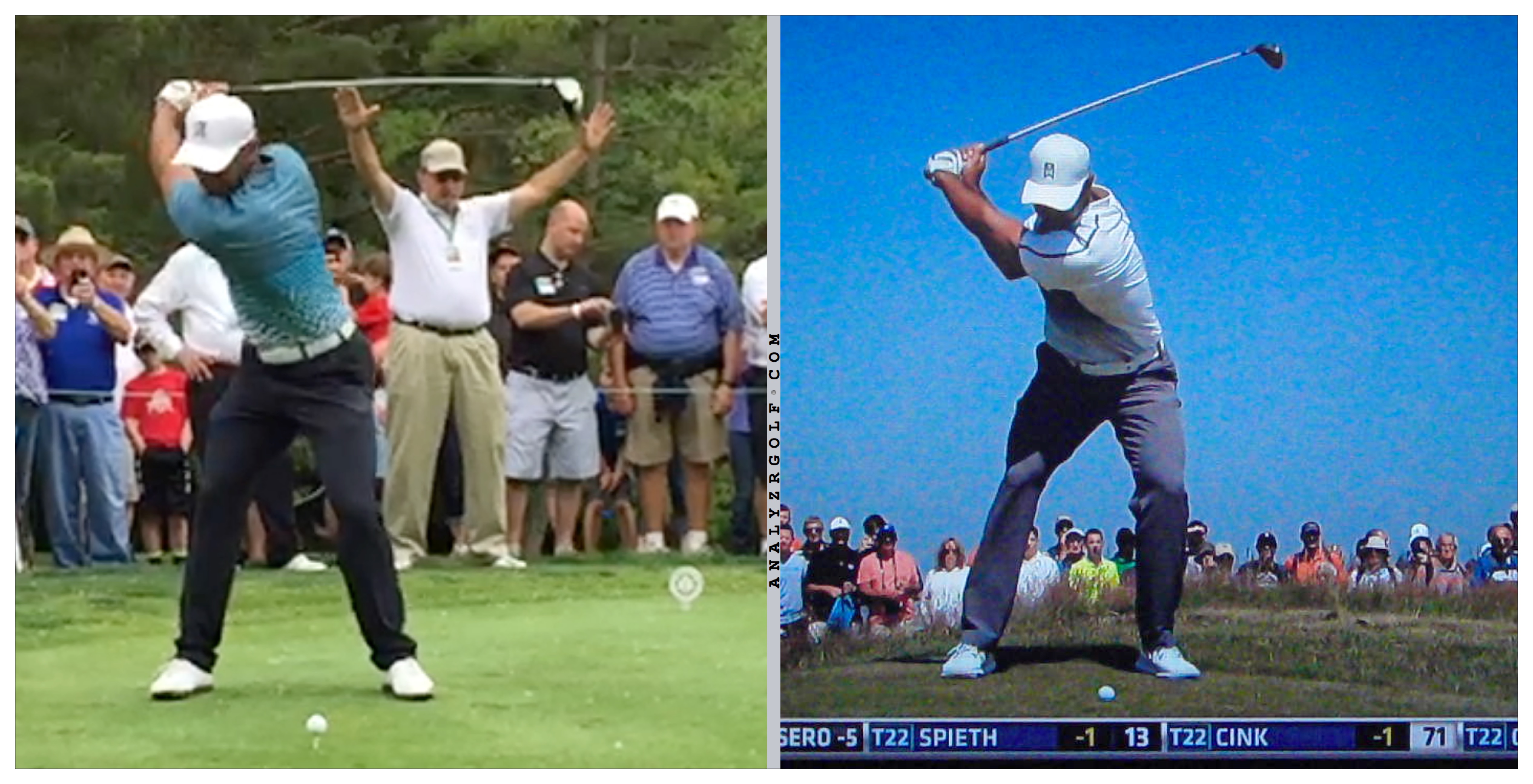 Flairing the front foot and rear foot out is ok. However at the impact position your left leg is not in Neutral Joint Alignment and could blow out your knee over time. Our knees is not made to go side to side, it go's up and down. Your position at impact in your old swing is much better. Hitting into a firm left side, left leg is straight.  Just an observation.