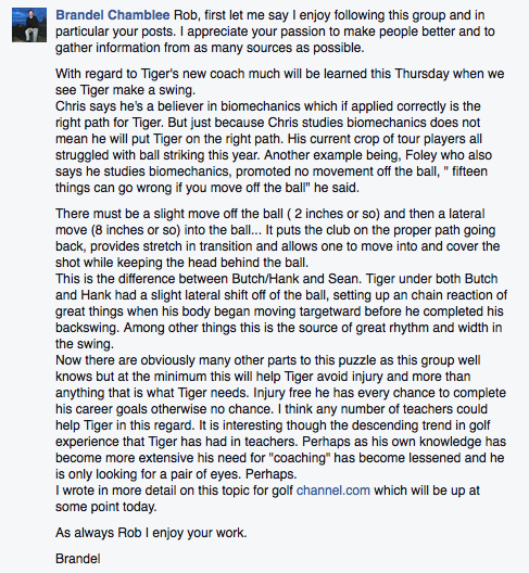 Maybe he means COP but then he also talks about the head moving in the Facebook post. Also if he did know about biomechanics he would know that Tiger would have had a rightward "shift" with his Foley back swing.