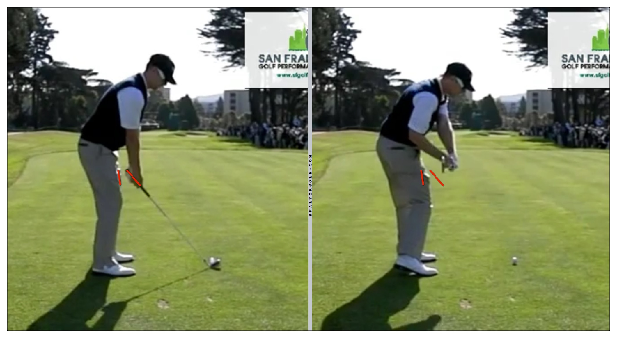 Almost everyone returns the shaft at a steeper angle at impact than at address. Some didn't. Since the ball is in the same spot, the hands are often a bit higher.