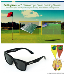 Kaya Optics, Inc., maker of sophisticated optical products for the security industry, announced today that it has extended its expertise to the world of golf, promising to transform the way the game is played with its new PuttingMonster™ stereoscopic green reading glasses. PuttingMonster™ uses advanced optics to reveal subtle surface differences in the contour of a putting green to a golfer. With PuttingMonster™, a golfer is able to read the break and grain of the putting green much more clearly and putt with more precision in the speed and direction of the putting stroke.