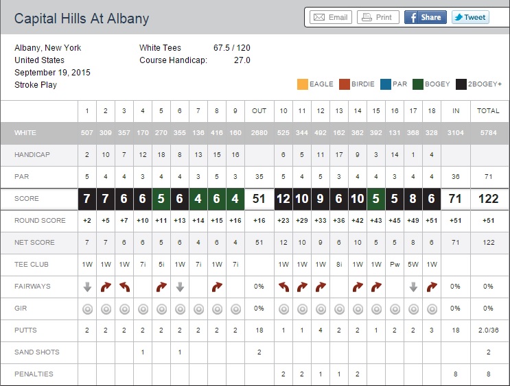 I'm somewhat dispirited about my game since July 2nd.  After losing all the weight I did, going to the gym, and the practice during the off-season, I feel my game has regressed severely since July 2nd to about the level where I was the first season I played where I'm spraying the ball all over.  The few decent rounds I've had since July 2nd I've found that my miss was consistent rather than sprayed all over the place.  I had drives of 96 yards and 108 yards, so not only am I spraying it left and right (but not middle since I had 0 FIRs), I'm also miss-hitting and not reaching the fairway,