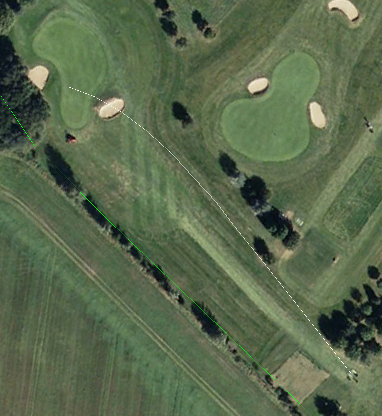 Again you tee off from the blue X. Obviously any kind of duff or top and you're in the pond and teeing it up again. You can see from the shadows that the 2 red Xs are pretty big trees - they're actually mature Oaks and you need to get between them. White marks the Out of Bounds so you have to take this route. If you don't draw the ball you'll end up in the area of that red circle and you're blocked out by the trees in front of you and your next shot is back the way you came - you have to be left side of the fairway or lay back a bit. I'll take the ditch on now and then if the wind's right but it calls for a good 270 yard carry. I've seen visitors eventually resort to a 9 iron over the oak tree having hit one or other a few times. You obviously play this tee twice in your round.