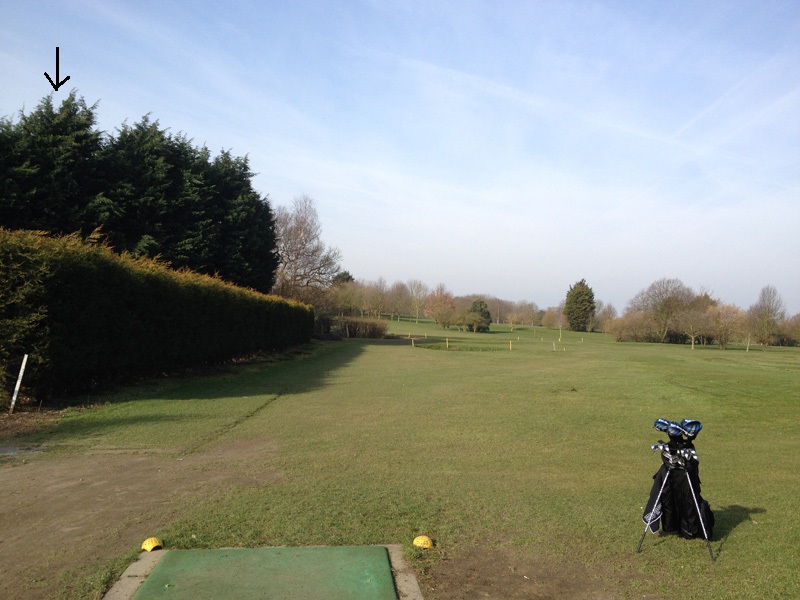 This is the par 5 tee off which you obviously do twice, this is the gap you're shooting at. If you have a particularly high ball flight you may clear the tree on the left with a 7 or more likely an 8 iron but then it's Out of Bounds all down the left hand side so if you pull it or draw it over there you're out of luck. In reality you're going for that gap with maybe a 5 wood to leave it short of the ditch or a driver to clear it. Left or right a tad and you're teeing it up again. And realistically you have to be drawing this one or you're in the trees right of the fairway which curves round to the left.