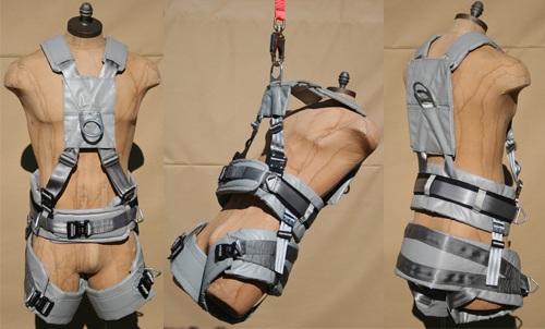 With a rope chair you might be afraid of falling off. With the harness, with a swivel joint on it, there would be no way to generate meaningful resistance to power a rotational movement. The rope would only be resisting gravity, holding you up above the ground, nothing more.  But you would have the freedom then to take a full turn and really let the clubhead swing around your center of mass. I bet with a little practice you could hit pretty well.