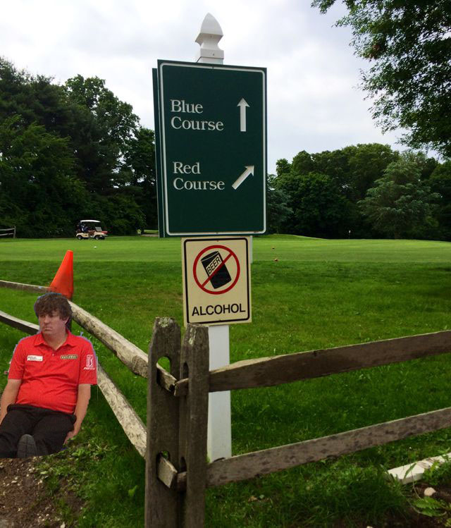 My course kindly reminds you that beer doesn't satisfy the course's stringent alcohol requirement, and to man up and bring some gin. I think that's what the sign means, anyway. [/quote]That's how I'd interpret that sign too! No beer! But hardstuff's ok. :-P