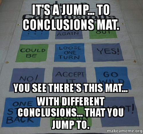 I should make a card game called jump to conclusions. Moderator draws a card that has a scenario described on it, and your objective will be to come up with a technically sane, but baseless conclusion. The crazier your leap of logic, the higher your score. There will be some natural winners on this thread