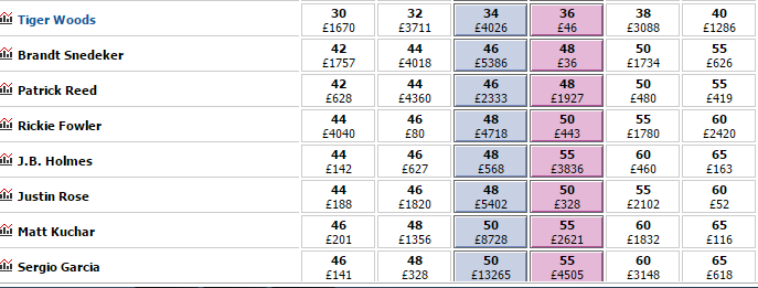 What each box means .. is that, taking Tiger for example, u could currently place a bet of $6k at 33/1, - to win $200k, with one click of a mouse - literally, in a micro-second.