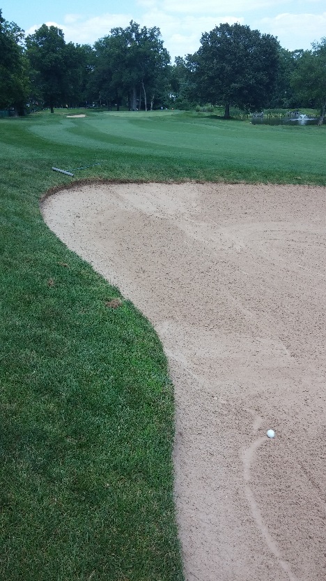 I had to play this shot with my left leg on the grass and my right leg in the bunker about a foot below the turf level with the ball laying several inches below that. I had to take a really open stance just to stand over the ball and swung pretty far to the left. I just focused on getting clean contact, hit a hard cut, and got a decent result: