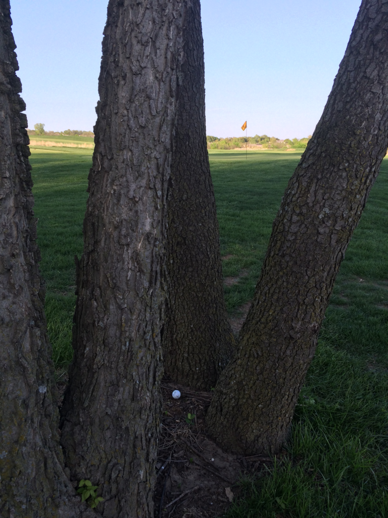 This situation was not staged. It happened yesterday. I was playing a round with Erik, my dad, and his friend. My dad's friend hit his tee shot right into a pine tree. When we went looking for the ball this is what we found.