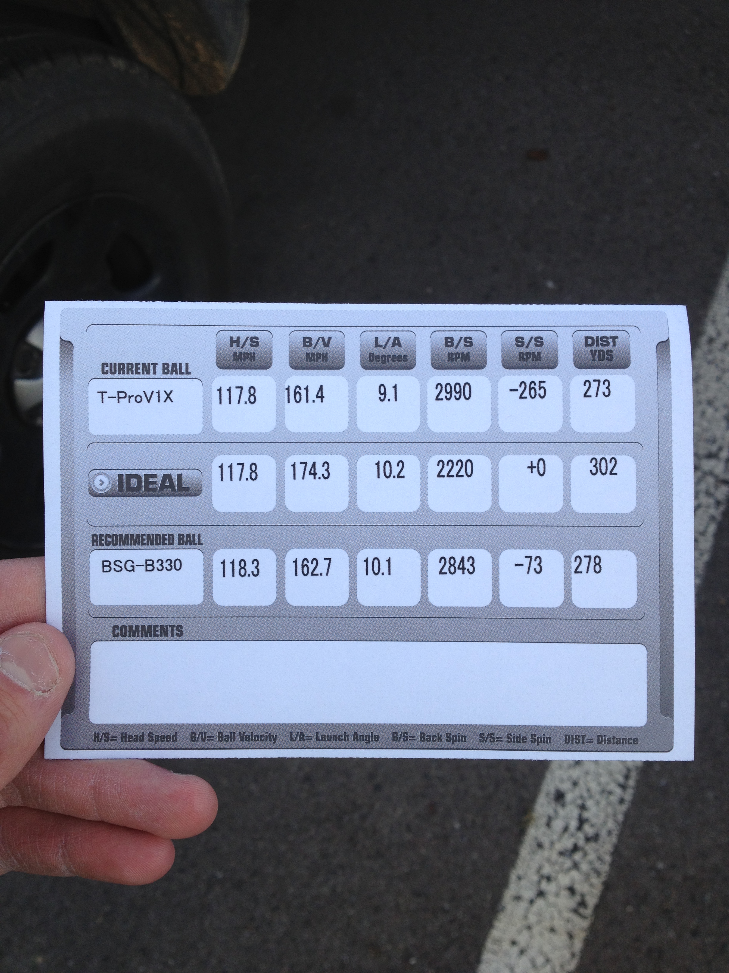 Odd sidenote about the Bridgestone fitting is that there was something definitely being mismeasured, either ball speed or clubhead speed. I know I have a smash factor above the ~1.37 that it estimated, so I can't guarantee the accuracy of any of these numbers. I did test the balls side-by-side afterwords on the course (they gave me a sleeve of the B330's to keep) and couldn't find a difference in performance, though the Bridgestone felt "softer".