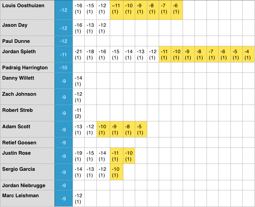 Again, no guarantees I've done this totally right, but these are some of the contest picks (-9 or better only listed). I've yellowed out any cells where the final score would mean the field backs up from the current lead -12, except when that was the only guess for that person.