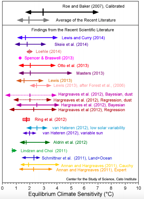 As I've said, it all boils down to how sensitive the planet is to CO2, and this is some evidence that politicians and government agencies are using high end estimates, as are some models. The media falls in line, uncritically. Many of these studies show that doubling CO2 will increase by 1-2 C. That is not calamity, from what I understand.  It is not great stewardship of our earth, and we must do better. It is also not a crisis of epic proportions that we must enact carbon taxes for immediately. I believe it's more likely we have time to figure this out.