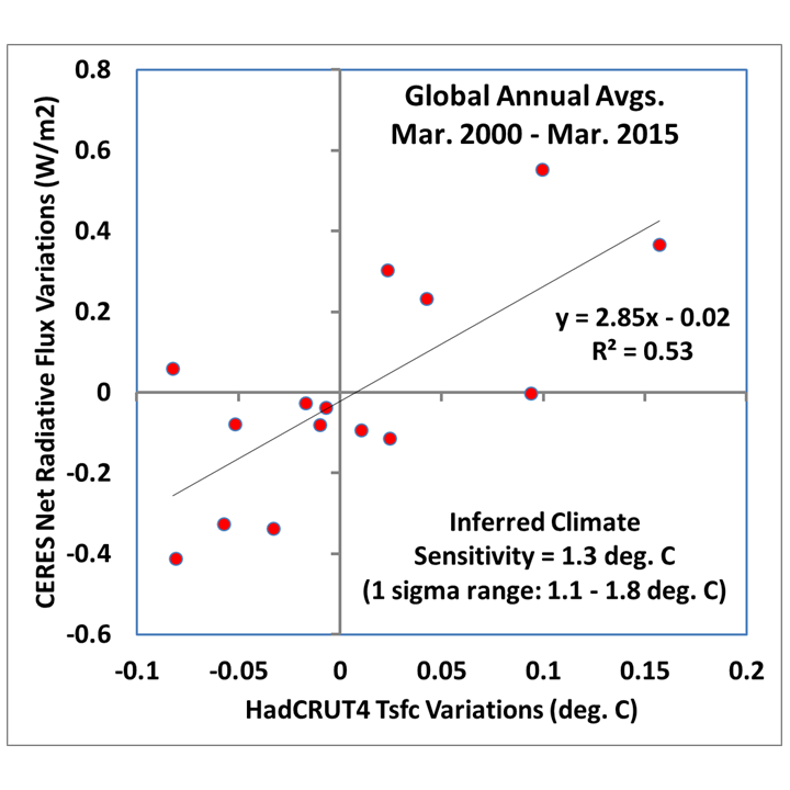 http://www.drroyspencer.com/2015/07/15-years-of-ceres-versus-surface-temperature-climate-sensitivity-1-3-deg-c/