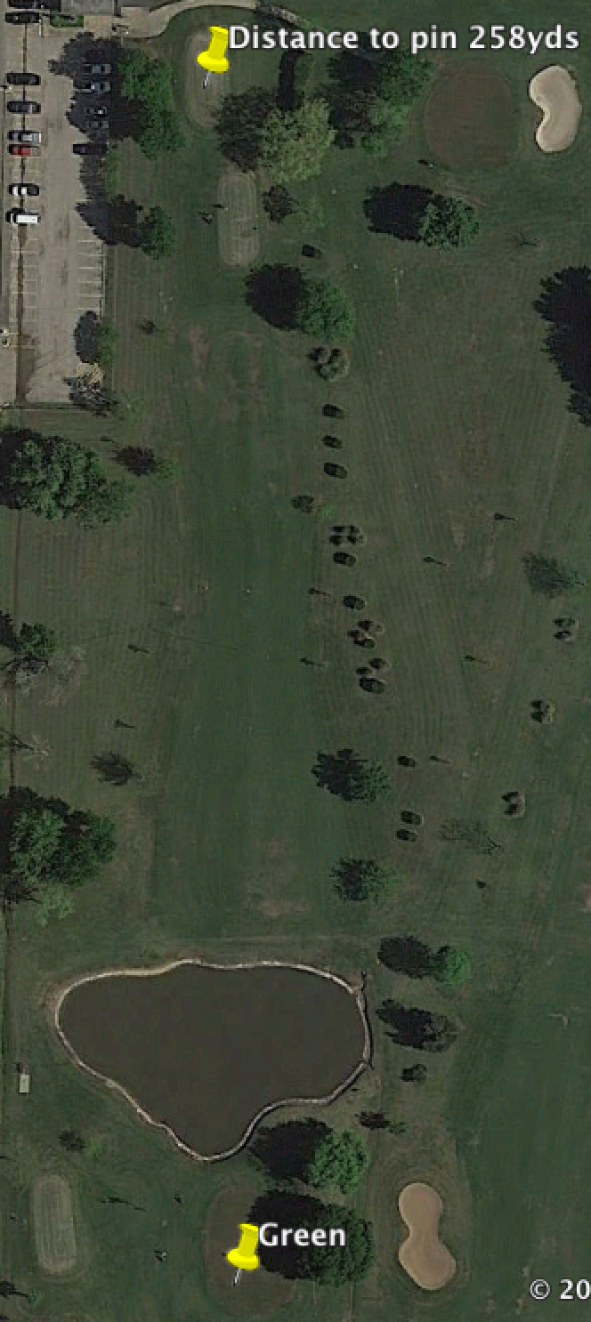 We have a hole almost exactly the same at my league course. It's a bit shorter, by about 30 yards, and it's about 70 yards from OB to OB each side of the green and long is dead. The safe shot is about 170 yards to the end of the fairway just short of the pond with about 55-60 yards to center of the green. To carry the water takes around 214 yards and the green is tiny at 20 yards front to back. I have been playing an 8 iron to the end of the fairway with a 1/2-3/4 60* wedge in, which is the safe play. However, I've started thinking its worth trying to go for it with either my 2 hybrid or 5 wood.
