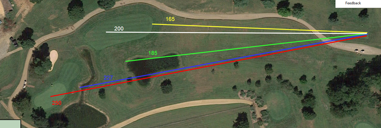 IF I manage to connect for a good drive, my avg distance is 235.  Around 1 out of 3 drives will connect for the long ball...but there is a water hazard in front of the hole with a steep lip around the back of the pond.  Should I risk a long drive over the pond or just play close to the water and pitch over it?  I have manged clear the water from the tee, but it will end up on a 35 degree slope under those two large trees near the green.