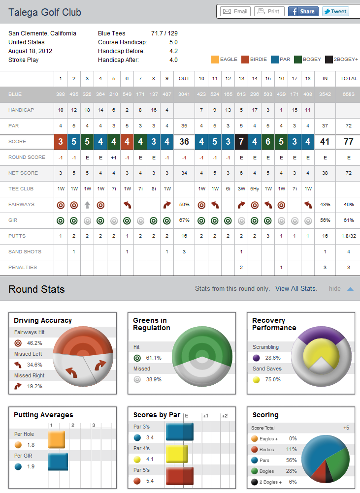 76. Five birdies, 3 double bogies. Feast or famine. I usually don't make a lot of birdies or big numbers. Kind of a wild day,but still a lot of fun.