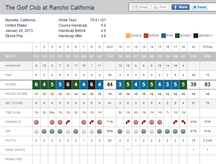 First round under ever. Shot a 99 with sopping wet course and overseeded Rye greens that roll like rumble strips literally!!! Temps were 28* when I teed off and only reached 40* by end of the game. My drives were incredible (for me) for the 1st time ever due to a lot of TV practice. 270 yds and straight until #15 and I started topping/hooking like it was my goal in life. An honest 99.