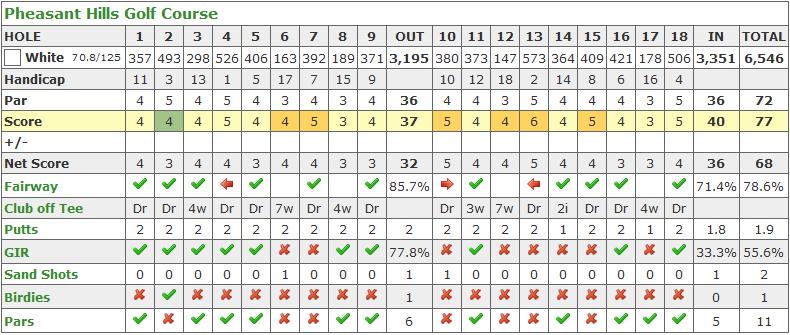 76 today on my home course, par 70 - CR69.8/113. The last two days I have actually hit the ball with the middle of the club face. I have started choking down on my driver and long irons and it seems to make a huge difference.