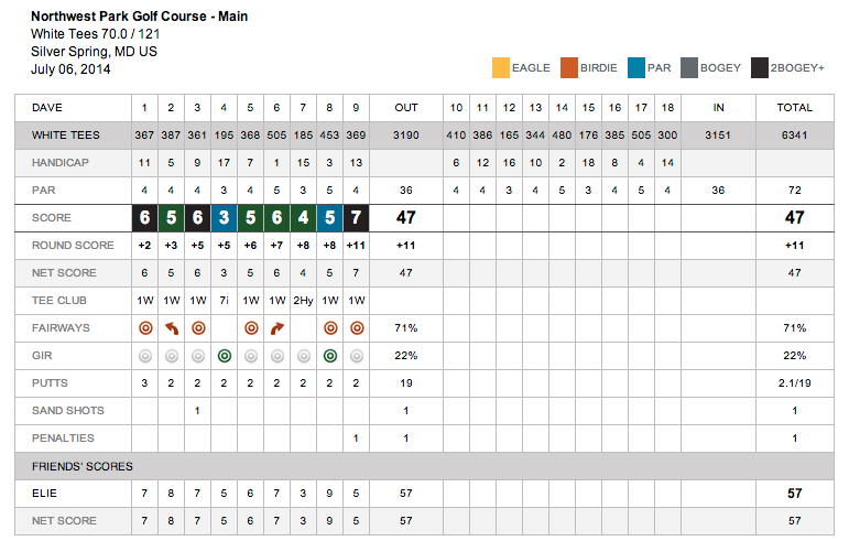 I shot a 47 on the front 9 of Northwest Park in Silver Spring, MD.  I'm pretty happy with that score.  I think on only 2 holes was I not near the great in regulation.  Hole 1 and 3 bad because short game miscues.  #9 is a bad tee shot, way left lost in the tall grass.