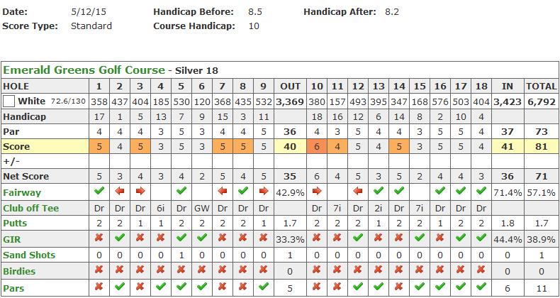 Hit a 47 on front 9. Missed most of the fairways but not by a ton. Missed some easy putts and hit a few fat 2nd shots, but the short game around the green was spot on. (Looks like the 56 60 degree Callaway wedges I bought are paying off.) I've been playing a little over a year consistently and have my handicap down to 23.7 (from over 30). Goal is to get it into teens by the end of summer.