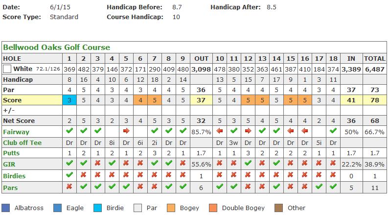 Carded a 78 (38-40, CR 68.4/124) today.  It's my personal best score :dance: .   The stats were 10/14 FIRs, 5 GIRs, 12 pars, 1 birdie, and 27 putts (ten 1-putts, one 3-putt).