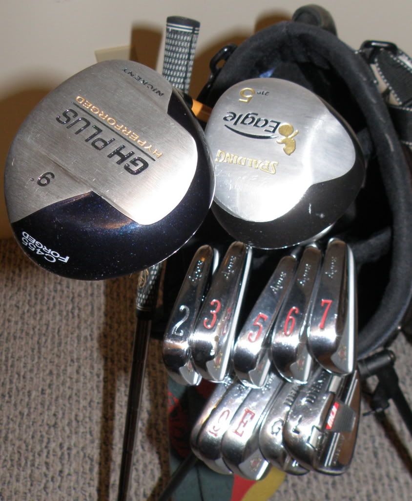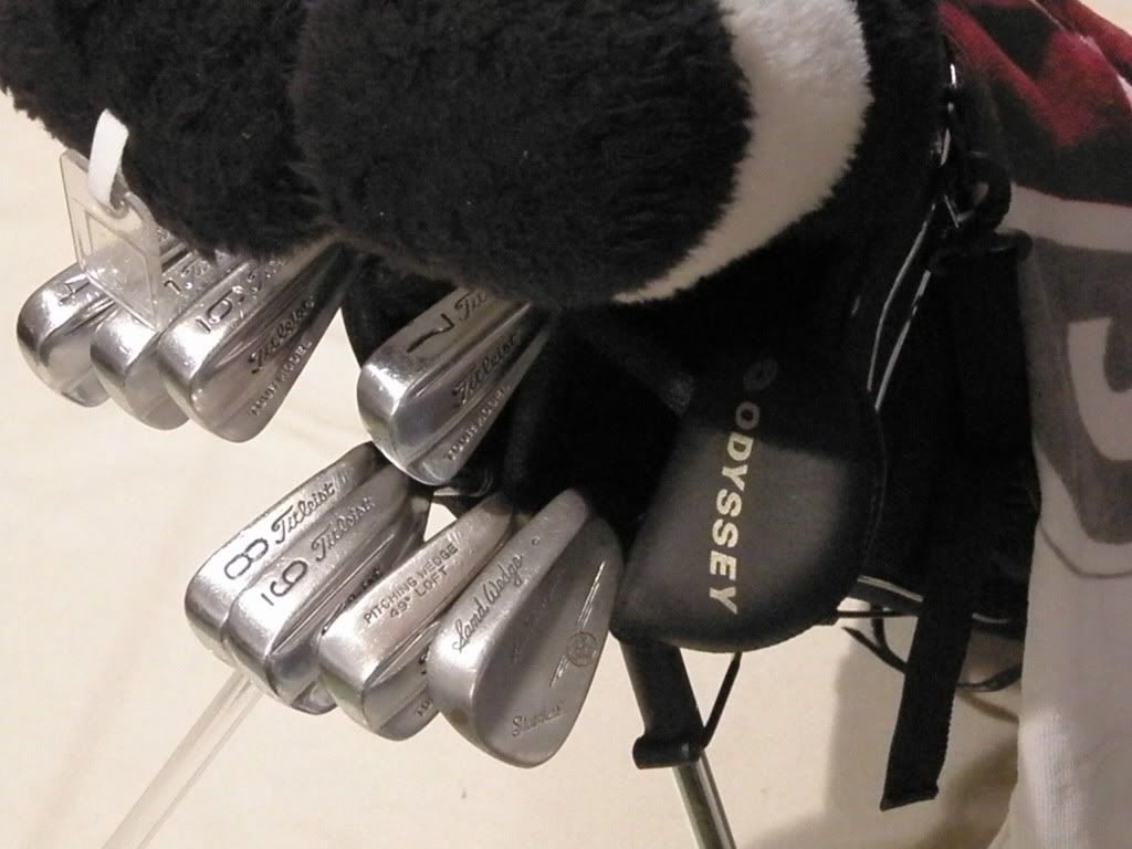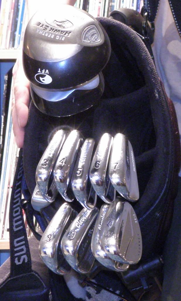 Mizuno MP600 driver, Cleveland '09 Launcher 3-wood, Callaway FTiz 18 degree hybrid, Cleveland TA1 3-9, Scratch SS8620 47, 53, 58, Cleveland Classic 2 mid-mallet, Bridgestone B330S, Sun Mountain four5.