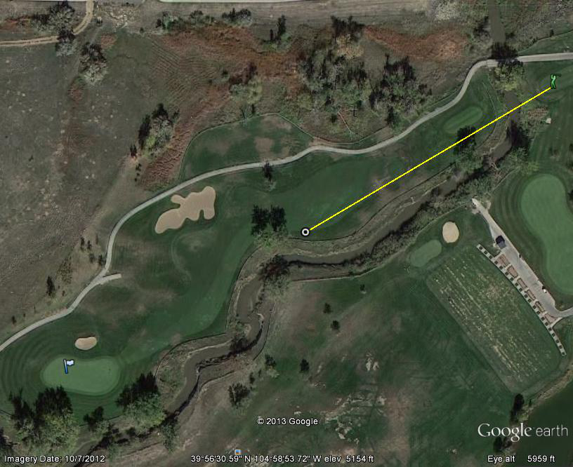 ...If he is 10' from the split-rail and as close to the trees as the overhead seems to have him, the angle pushes you too far to the right.  A straight 155yd shot would put you out over the end of that fairway bunker and out in the desert...