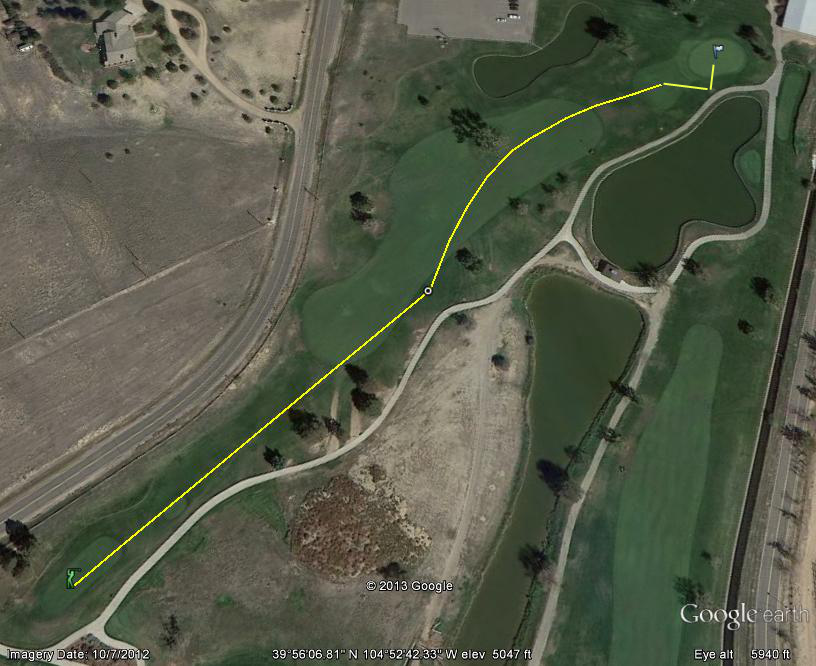 I aim at the fairway trap and try to draw around the trees on the left to the dogleg LZ. Pull hook and try to talk that recalcitrant ball to a stop before she runs OB under the fence.